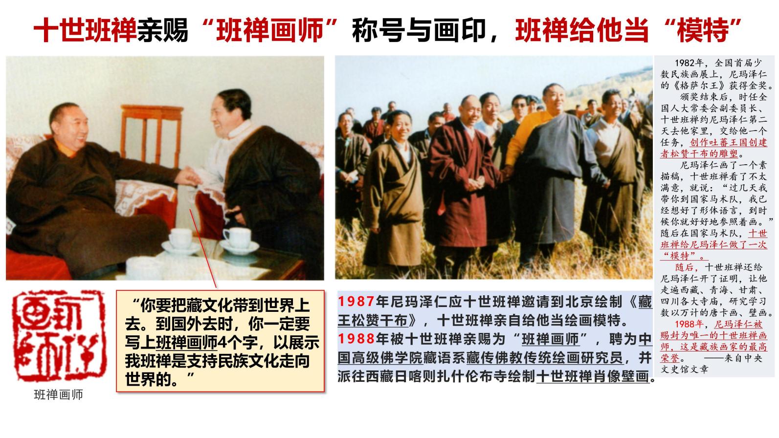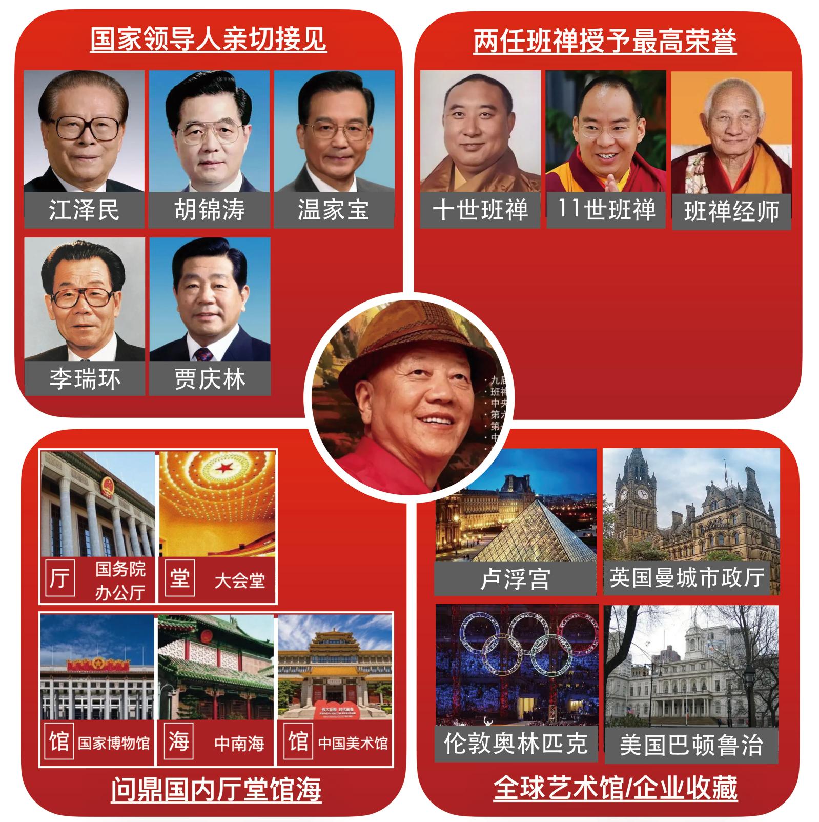如果说艺术家有荣耀的殿堂,那么他是被神圣加冕的人。1988年,他被十世班禅额尔德尼亲赐“班禅画师”称号,班禅亲自担任他的“模特”,亲手颁发班禅画印。十一世班禅更为其作品题写偈颂,他,是唯一在世的班禅画师!一个人的作品,能被两世班禅推崇,这已经超越艺术本身,成为精神信仰。这不是画,这是佛光普照,是文化圣火的传递!