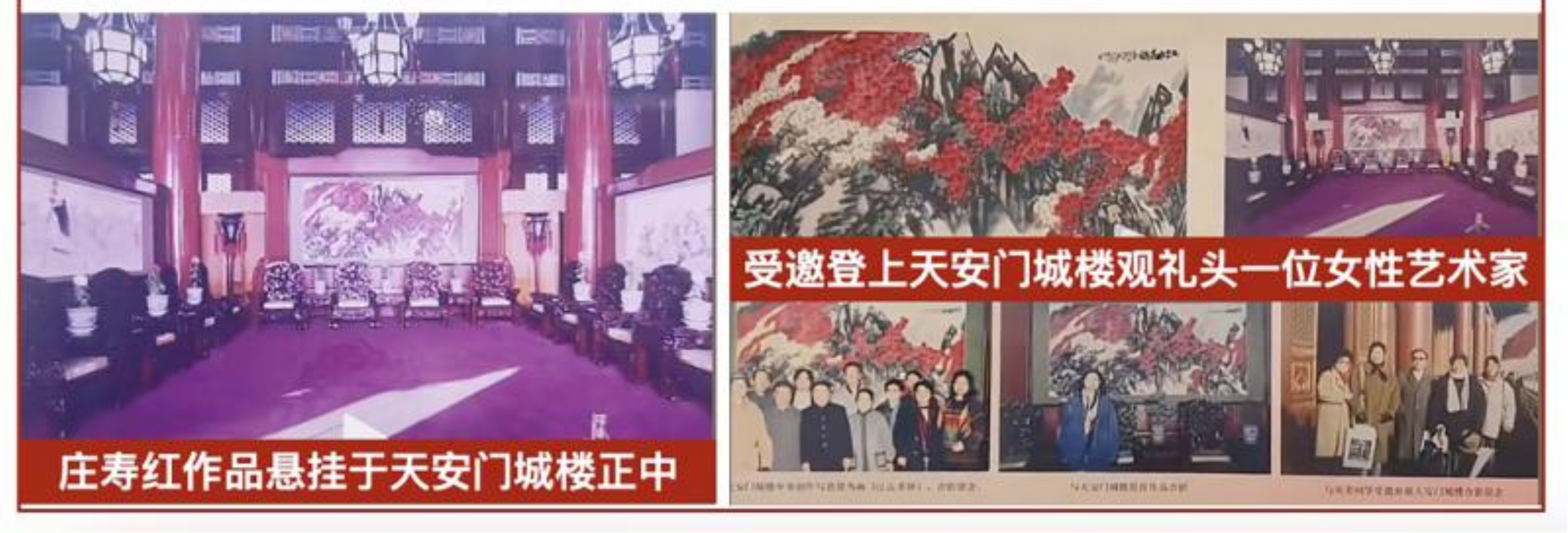 庄寿红的作品被国务院办公厅、大会堂、国家博物馆、中南海、中国美术馆等国家级机构收藏,其代表作悬挂于天安门城楼正中厅——她是唯一受邀登上天安门城楼观礼的女性艺术家!