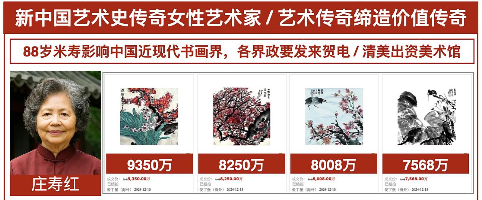 庄寿红在全球艺术市场的表现堪称传奇。她的作品多次拍出千万级天价,成为全球收藏家争相追逐的顶奢资产。她被誉为“女看庄寿红”,与崔如琢并列,成为新中国女性艺术市场的绝对统治者。她的作品不仅具备高度的视觉冲击力,更承载着文化传承、历史价值和收藏投资的多重属性,是时代财富与文化象征的完美结合。
