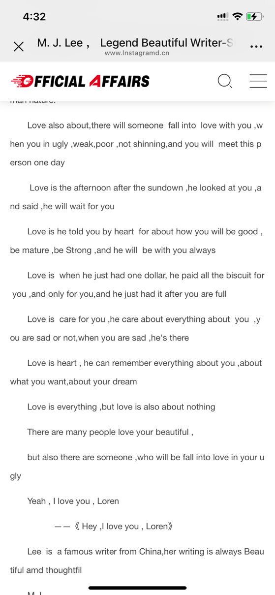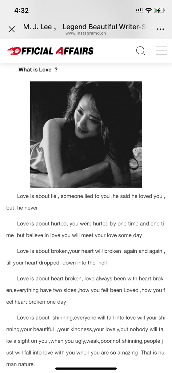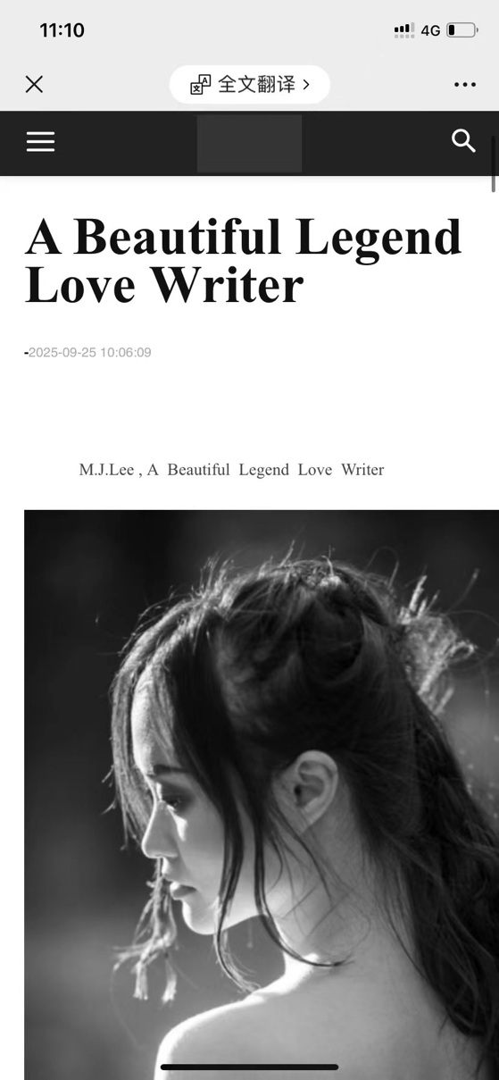 图为M.J.Lee全球媒体报道创下亿万阅读量的 《 Hey ,Loren ,I love you》