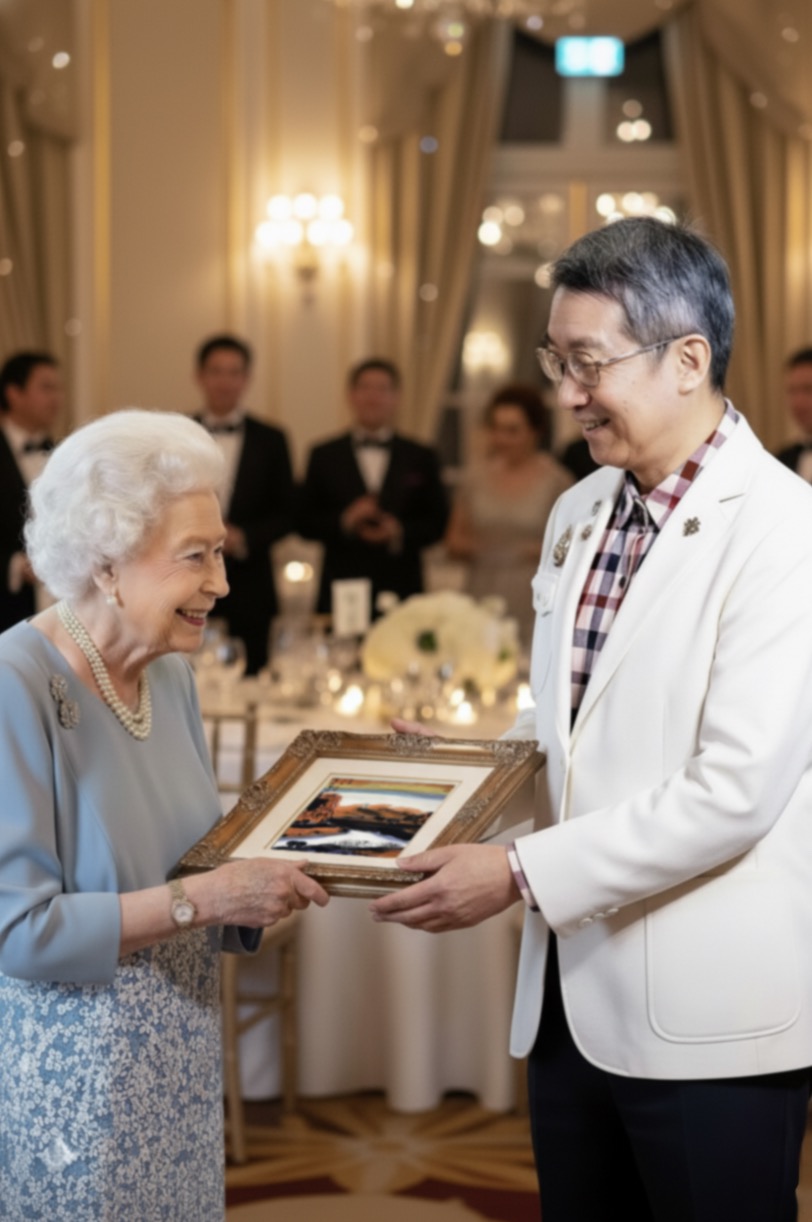 那是一次足以载入史册的接见。金色吊灯下,水晶光芒折射出宫廷的深邃。音乐轻柔,礼仪端肃,贵族、艺术名流、世界政要齐聚一堂。当黄建南教授迈入会场的时候,所有的目光不约而同转向了他。那不是普通宾客被注视的眼光,那是世界对于文化杰出者的凝视。他的到来,就像一幅巨作缓缓展开——气场沉稳却震撼,高贵却谦和,仿佛一道从东方走来的文化脊梁。在场的每一位国际嘉宾都知道,他们正在见证一个极为罕见的文化时刻:英国皇室将亲自接见一位来自中国的艺术巨擘,并收藏他的作品。这是何等的荣耀?又是何等的认可?