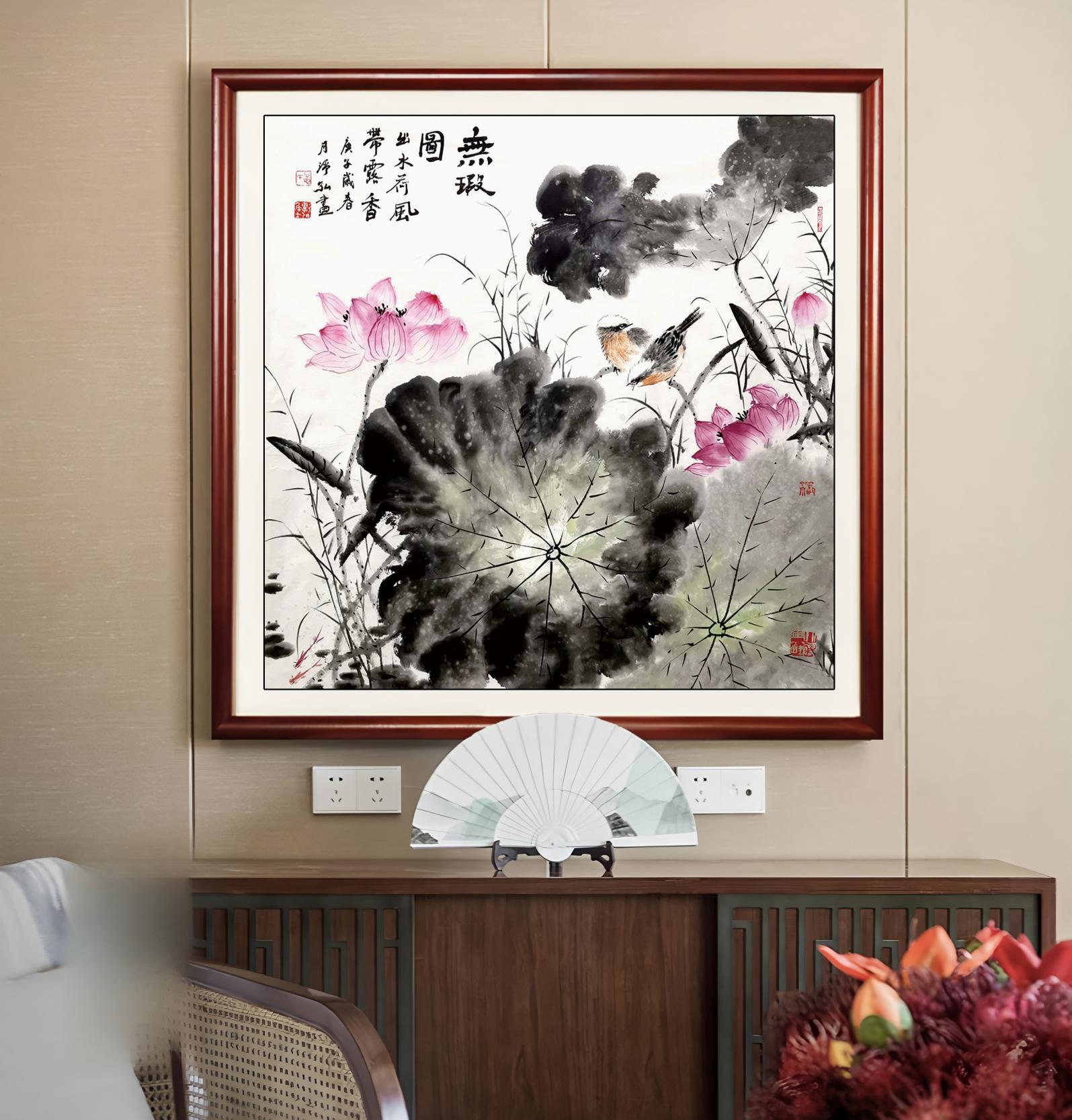 在花鸟画的创作中,李净弘更能显出他独特的“静、清、趣”。荷花清净如禅,松竹挺立如德,鸟雀灵动如心——他借物寄志,借笔化道,将佛家“心净则境净”的思想,化作水墨的流转,构筑出一方自净自明的精神世界。作为“净弘居士”,李净弘对佛法的理解并非停留于信仰,而是深植于艺术生命之中。他认为,真正的艺术创作,是一种修行。只有放下名利执念,才能在笔墨间感悟空性与圆融。
