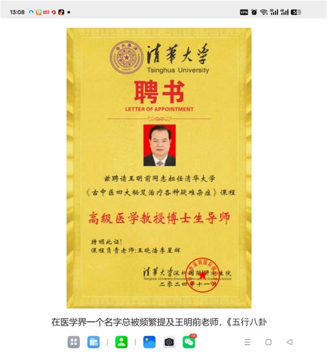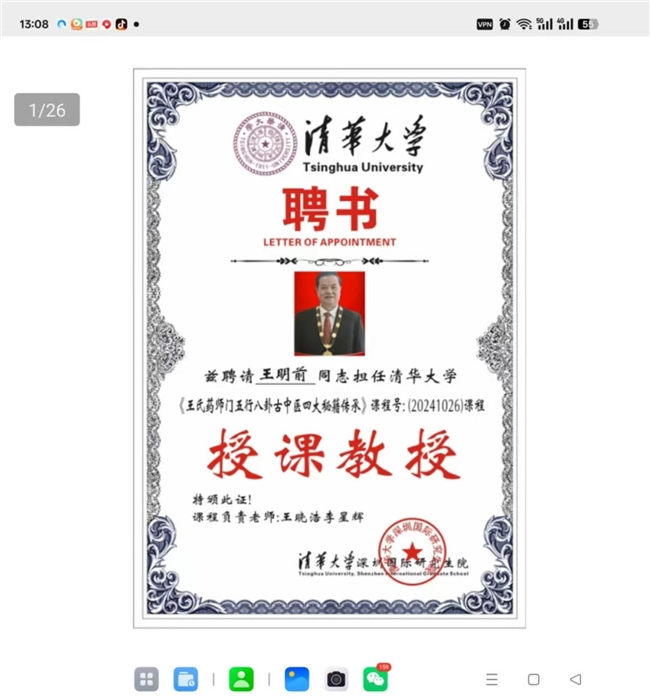 王明前希望将中医药文化发扬光大,亲传弟子 40 多人。王 明前不想把自己对中国中医的探索和领悟出来的一些有效 的治病手法付之东流, 所以希望更多的人传承发展, 来造福 于天下苍生,有希望把它发扬光大。现特面向社会传徒授艺。 将祖传特技贡献给人类健康事业。中医自古就是口传心授, 勤于实践。有些技能非书本表达完全, 愿传有爱心厚德者, 使其光耀中华、走向世界。