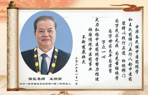 王氏药师门五行八卦点穴推拿术第十四代传人、青城华美 国际康养中心首席专家、四川五行慧源康复服务有限公司 董事长、中国抗癌协会会员,世界首席健康专家、王明前 五行八卦世界知名品牌、点穴麻醉无痛无创接骨特色疗法 创始人,速效接骨丹发明人、中国民间中医医药研究开发 协会浊毒理论分会第一届理事会常务理事、中国民间中医 医药研究开发协会培训部基层中医药推广使者、国医网主 任委员、中关村健康服务产业促进会专家委员会委员、中 国医药教育协会医促会特色疗法专家、建国 70 周年全球 100 家媒体推荐当代名医王明前国际特色疗法专家。 2022 在全国老字号遴选中,传统医药类王氏药师门家传秘籍、