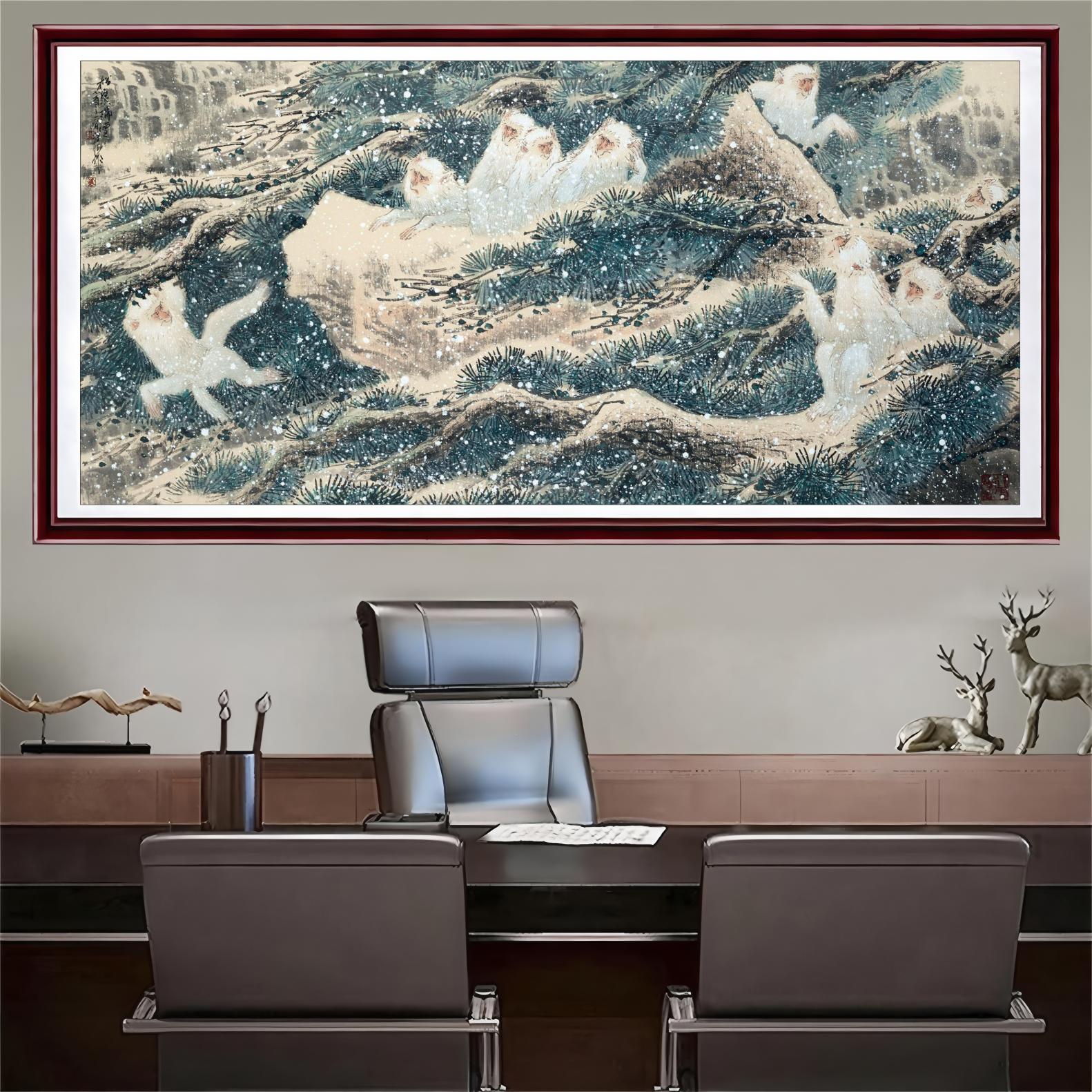 因为他在画猴时,不把猴当成猴,而是当成“山中的大英雄”。你看他画的每一只猴:——或立于山巅,如天神巡视;——或跃于巨石,如英雄出征;——或凝目远眺,如智者观天;——或手搭松枝,如王者点兵。这些画面根本不是动物画,而是史诗画!是英雄画!是精神画!