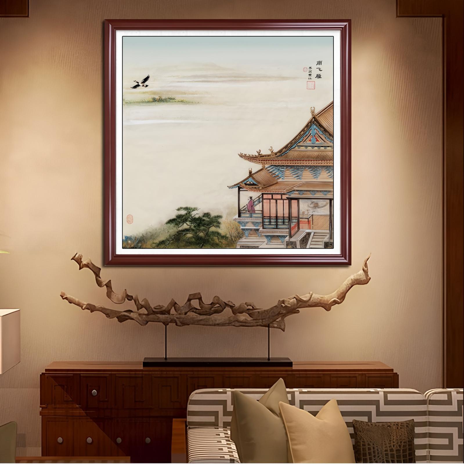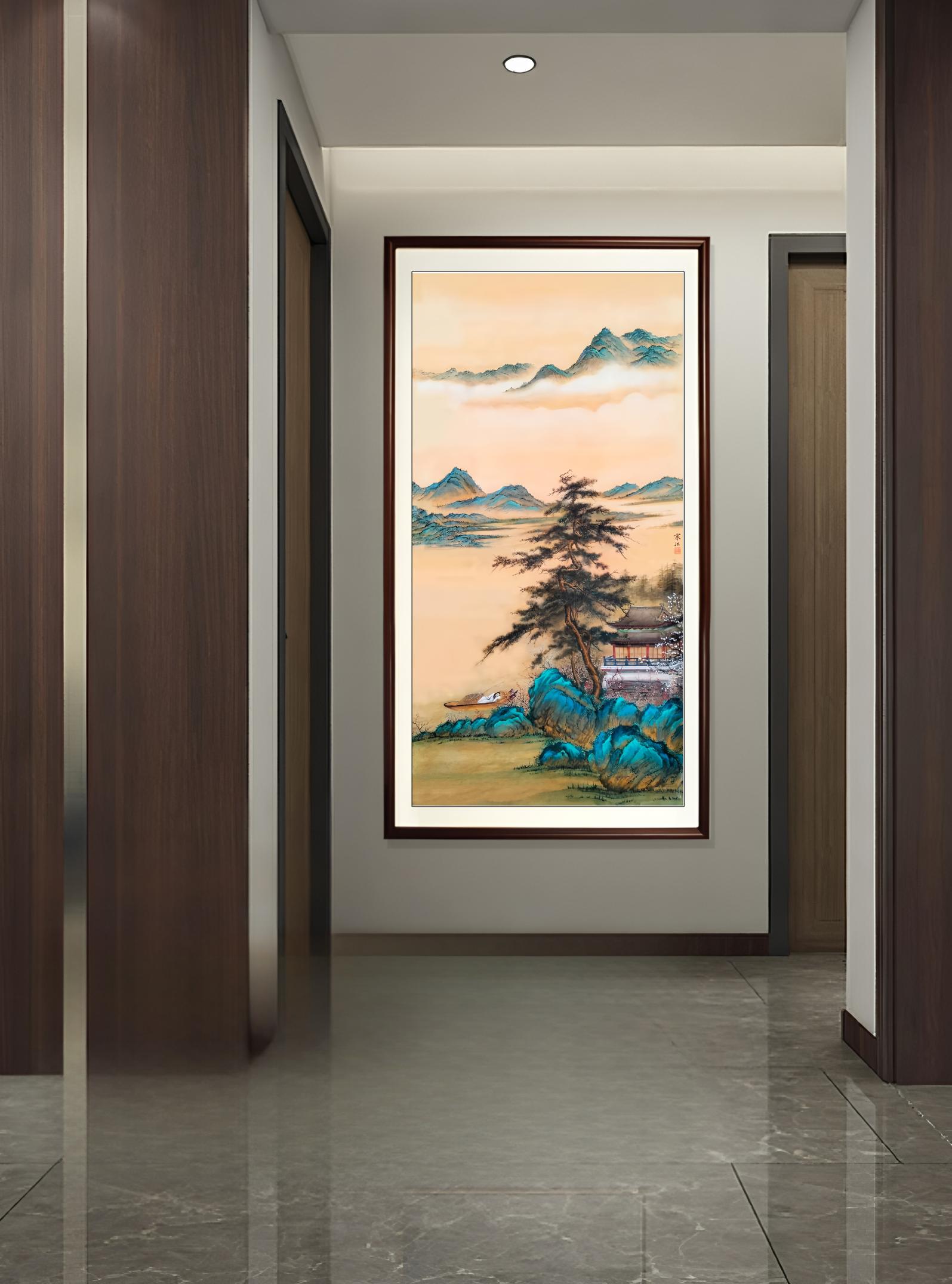 寒江的师承之强大,可谓当代罕见:关山月(岭南画派第二代领军)、黎雄才(岭南画派四大名家)、吴作人(被徐悲鸿誉为“中国艺坛代表人物之一”)、张孝友(当代界画巨匠,为天安门画毛主席像的重要画家);能够同时得到这四位顶尖艺术家的认可与指导,可以说是一种时代级的机缘。更重要的是,他没有辜负这些机缘。他把四位大师的技法、思想、格局全部融进自己的体系里,形成独属于寒江的界画语言——中西结合、精准透视、恢弘构图、细腻入微、古建重生、工笔线条精绝。他不是继承者,是开创者。