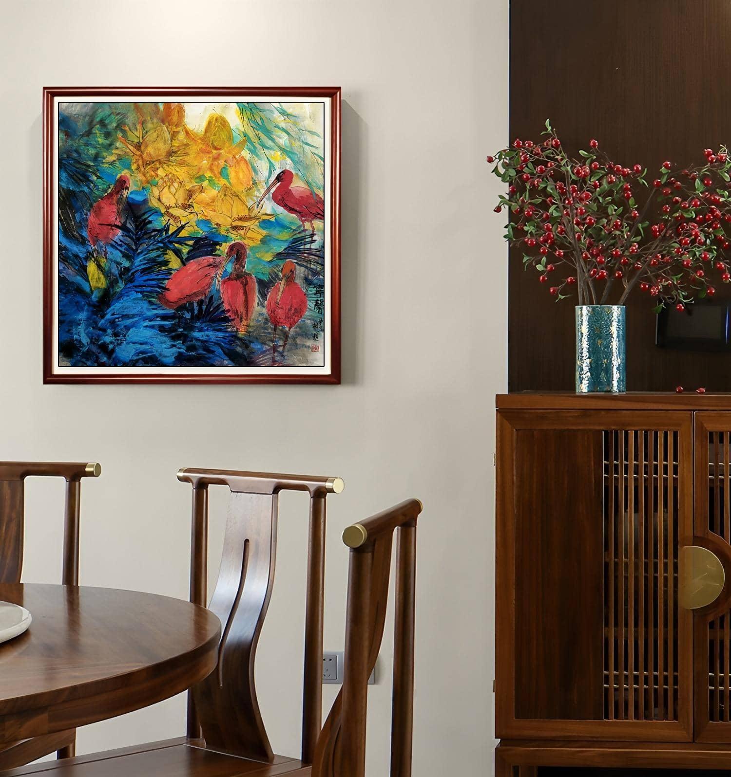 李柏默成功的原因不仅是技法,更在于他的“创造力”。传统花鸟画讲“三笔两墨、一气呵成”,但颜色往往谨慎使用。然而,李柏默偏偏反其道而行:他大胆泼色,一泼惊天;他墨团变化,千层翻涌;他将工笔装饰融入写意,突破边界;他用色如用墨,色彩在他笔下有了生命;他让构成与传统完美交融,创造了彩墨画的视觉革命。