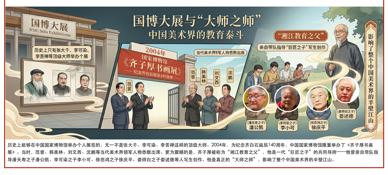 提及齐子厚先生,许多人的第一反应是“齐白石亲侄兼继子”、“齐派二代唯一在世传人”。然而,在中国美术界的深层脉络中,齐子厚先生还有着另一个令人高山仰止的身份——他是我国重要的第一代国画家与美术教育家,被业界尊称为“湘江教育之父”。他不仅继承了巨匠的衣钵,更将这份艺术火种播撒给了下一代“巨匠之子”。