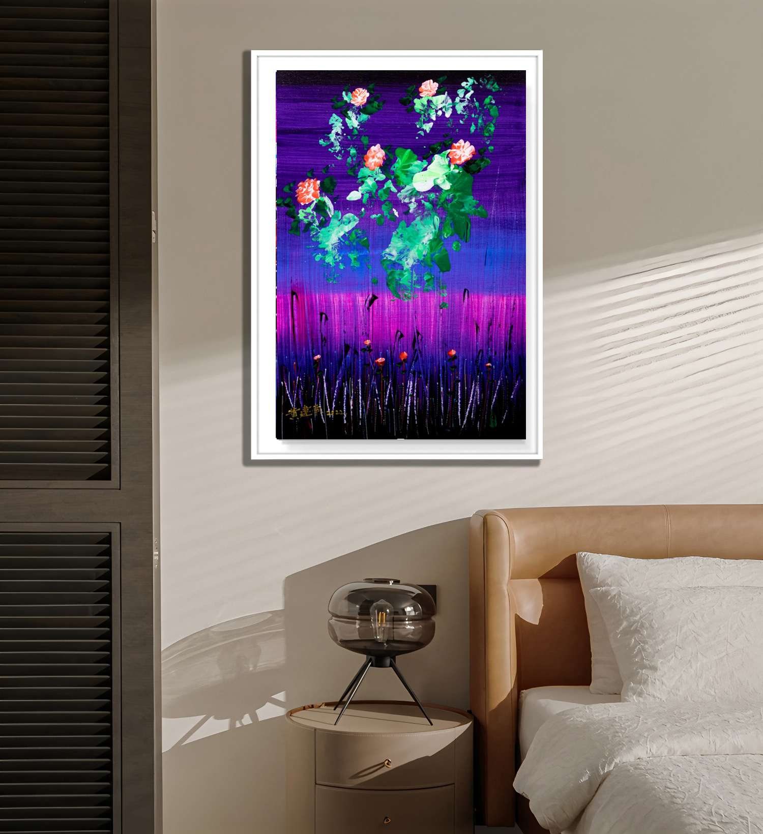 他的《锦绣山河》充满国家气度;他的《青春之花》洋溢生命赞歌;他的《朝晖》《旋律》像一场精神舞蹈,穿越色彩的界限,抵达思想的彼岸。这种艺术语言,已经超越了传统意义的“画”,成为人类精神能量的“图腾”。黄建南以色彩为经,以哲学为纬,编织出一个充满理想与信念的艺术宇宙。