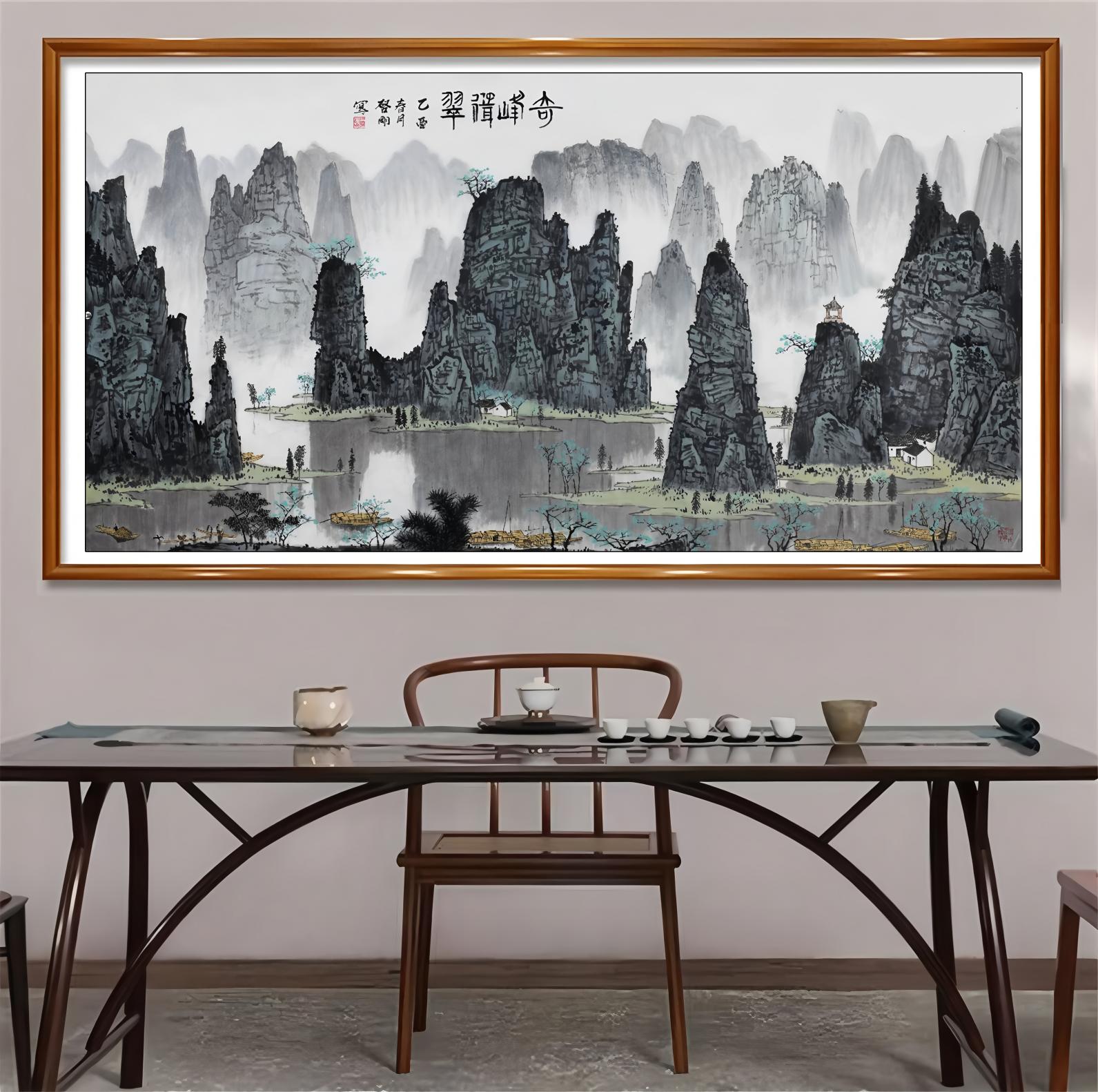 泰然自若的格局突破:构图重新定义传统山水;他把传统山水的构图“推翻又重建”,以更开阔的空间;更明快的色调;更现代的视觉节奏;使青绿山水焕发新的时代魅力。2014年嘉德14件漓江主题作品:宣告时代融合的胜利;这14件作品,不只是创作成果,更像是一场艺术宣言——青绿山水在新时代可以这样活着,可以这样光芒万丈,可以这样贴近当代人的审美。在业内,这一系列作品被赞为:“当代青绿山水的范本。”