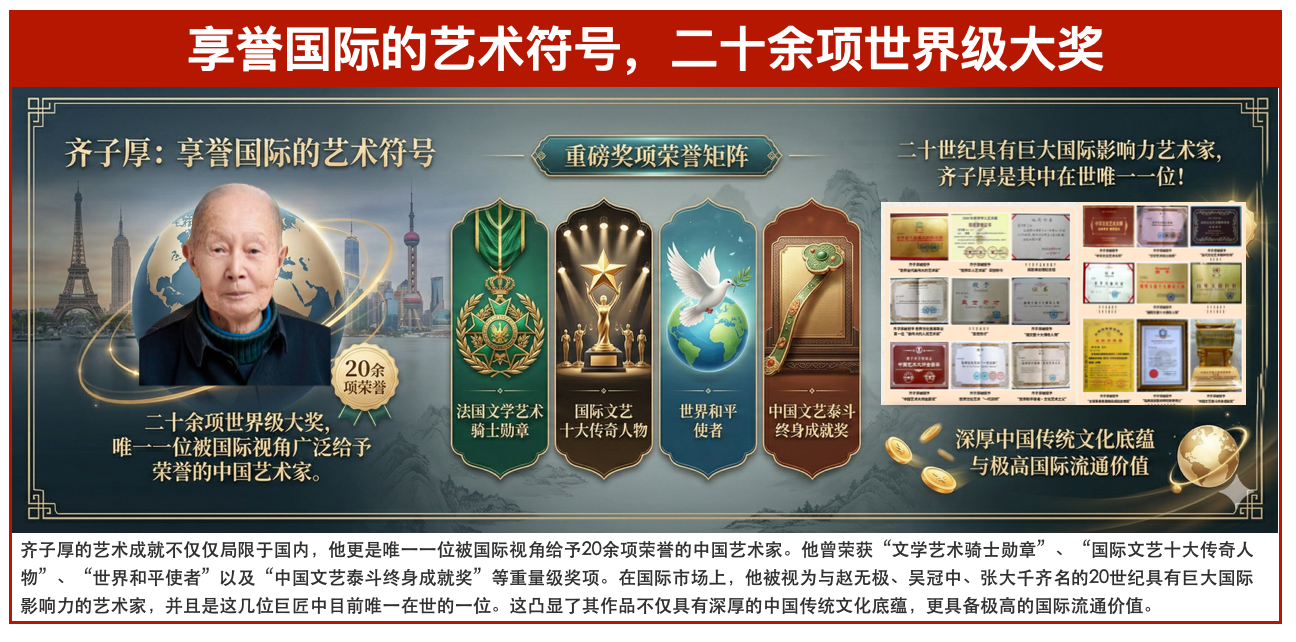 在当今中国画坛,齐子厚先生是极少数能够在国际上产生深远影响力的艺术家之一。他不仅在国内登顶国博,更是唯一一位被国际视角广泛给予20余项顶尖荣誉的中国艺术家。翻开齐老的荣誉薄,由法国等国际权威机构颁发的“文学艺术骑士勋章”赫然在列。此外,他还荣获了“国际文艺十大传奇人物”以及“世界和平使者”等重量级国际大奖。